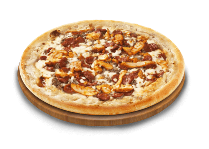 Crème fraîche, fromage, poulet curry, merguez, cheddar.