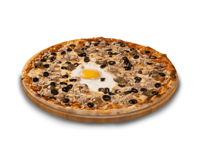 Tomate, fromage, thon, champignons, piment jalapenos, oignons, olives.